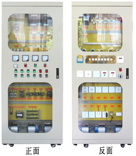 1、智能樓宇電工實(shí)訓(xùn)裝置采用正反二面開(kāi)門(mén)的離墻式威圖電氣控制柜,且正反面同時(shí)都可以操作,柜體中寬度能保證兩個(gè)學(xué)生同時(shí)合作接線實(shí)訓(xùn)的需要,其外形尺寸寬×厚×高分別為:800×600×2000 mm。柜體采用厚度為國(guó)標(biāo)1.5以上的優(yōu)質(zhì)鋼板,柜門(mén)采用厚度為國(guó)標(biāo)2.0以上的優(yōu)質(zhì)鋼板并安裝四塊大的玻璃,學(xué)生能通過(guò)玻璃看清柜內(nèi)各元器件及相應(yīng)的動(dòng)作,金屬表面噴塑,柜體中間有二塊優(yōu)質(zhì)環(huán)氧樹(shù)脂絕緣板和相應(yīng)的支架系統(tǒng)隔離正反兩個(gè)柜體,安裝板上安裝智能建筑電氣控制線路各實(shí)訓(xùn)考核模塊。各元器件所有的接線端都連接至相應(yīng)的專(zhuān)用實(shí)訓(xùn)接線端子上,每個(gè)接線端上都套有用電腦打印接線端名稱及編號(hào)的套管,并且更換方便。被控制電機(jī)安裝于電氣控制柜內(nèi)。